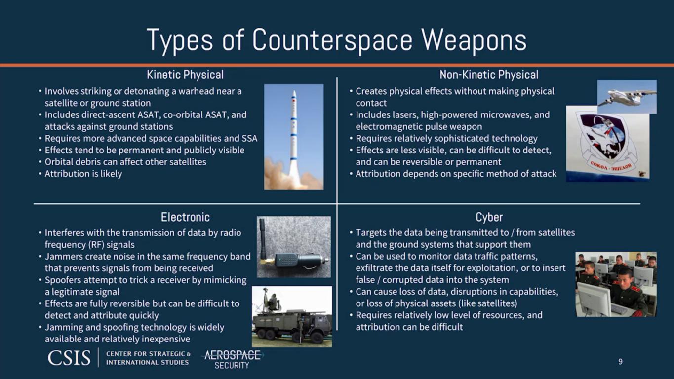 On the left side, we can see another threat to space systems that is very difficult to deal with. These are laser precision weapons that are used to dazzle or blind imaging satellites. It is also another type of attack that is very difficult to deal with.